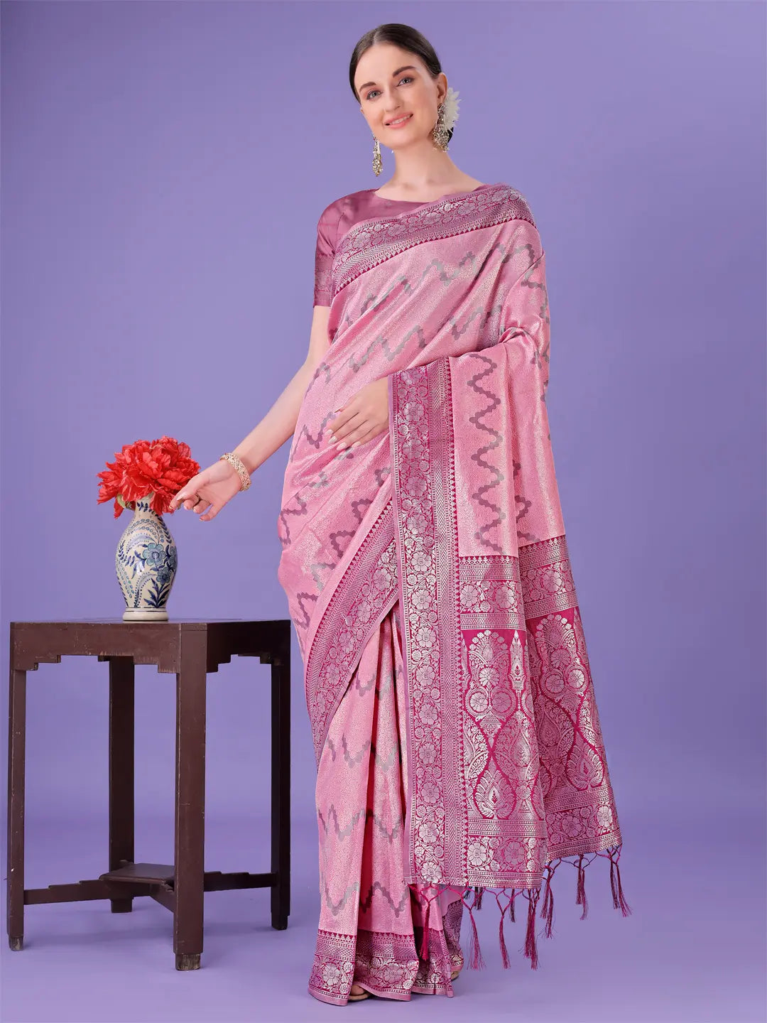 This blush pink Litchi Silk saree from Deeva captures the charm of traditional style with...