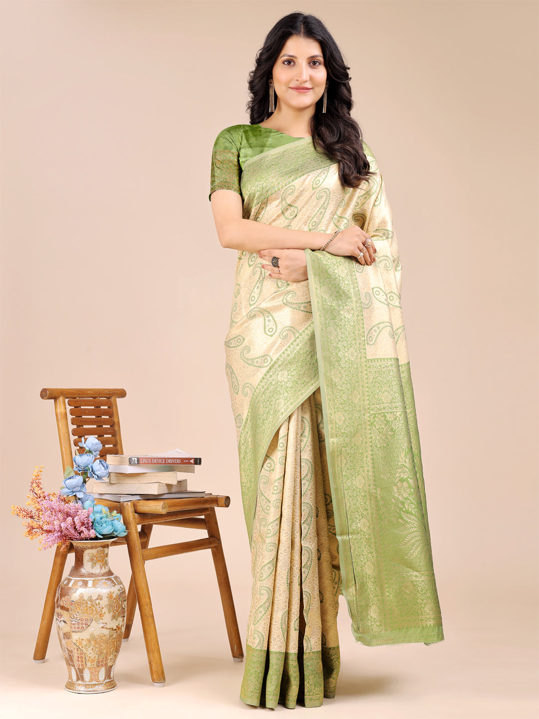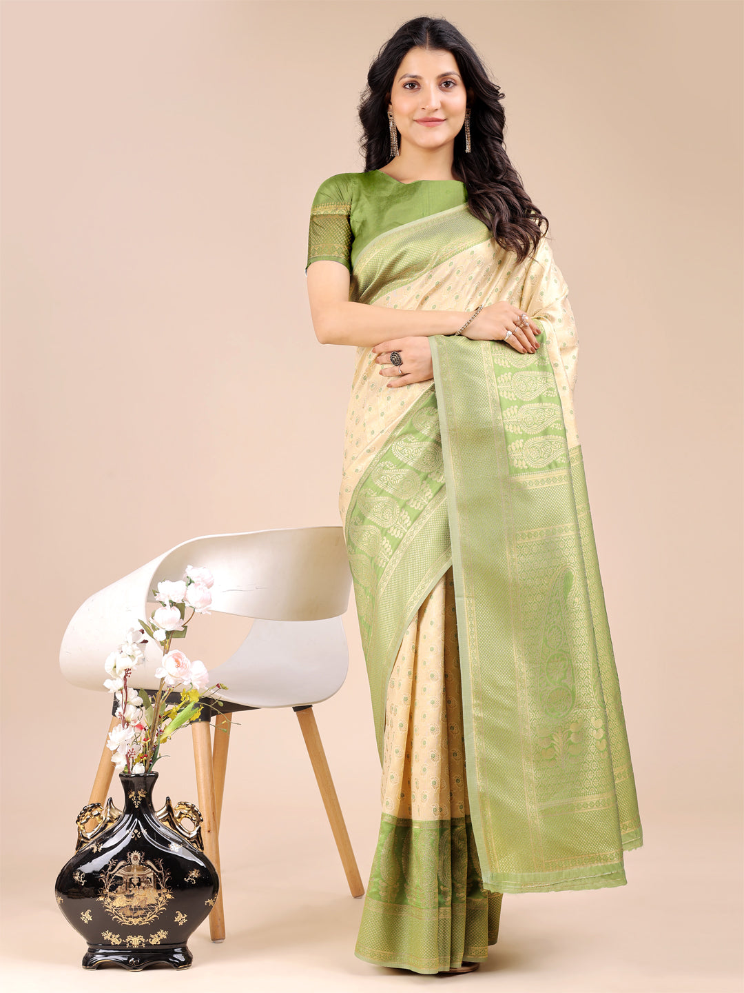 Elegant Cream & Light Green Banarasi Silk Saree