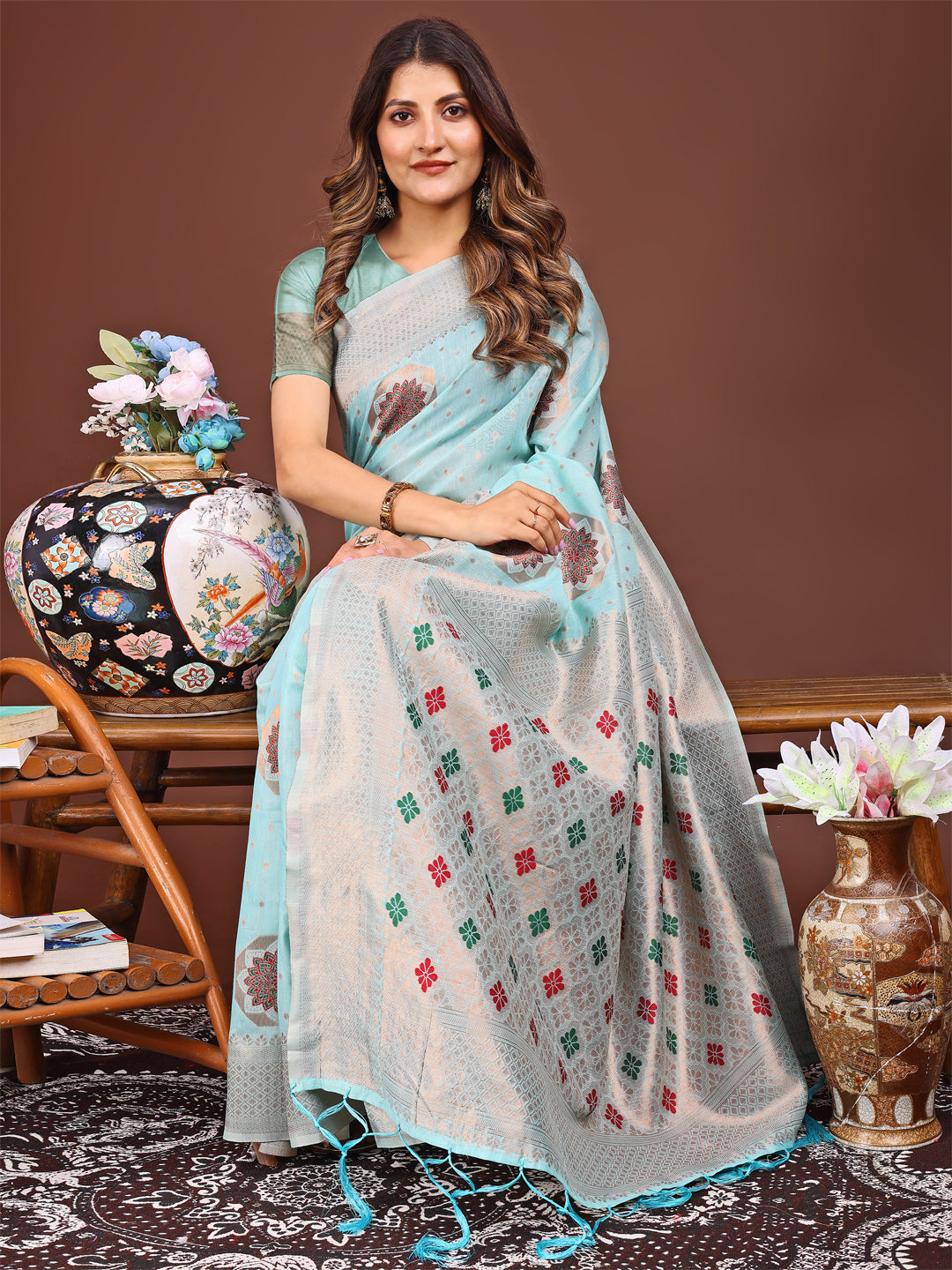 Sky Blue Linen Cotton Saree