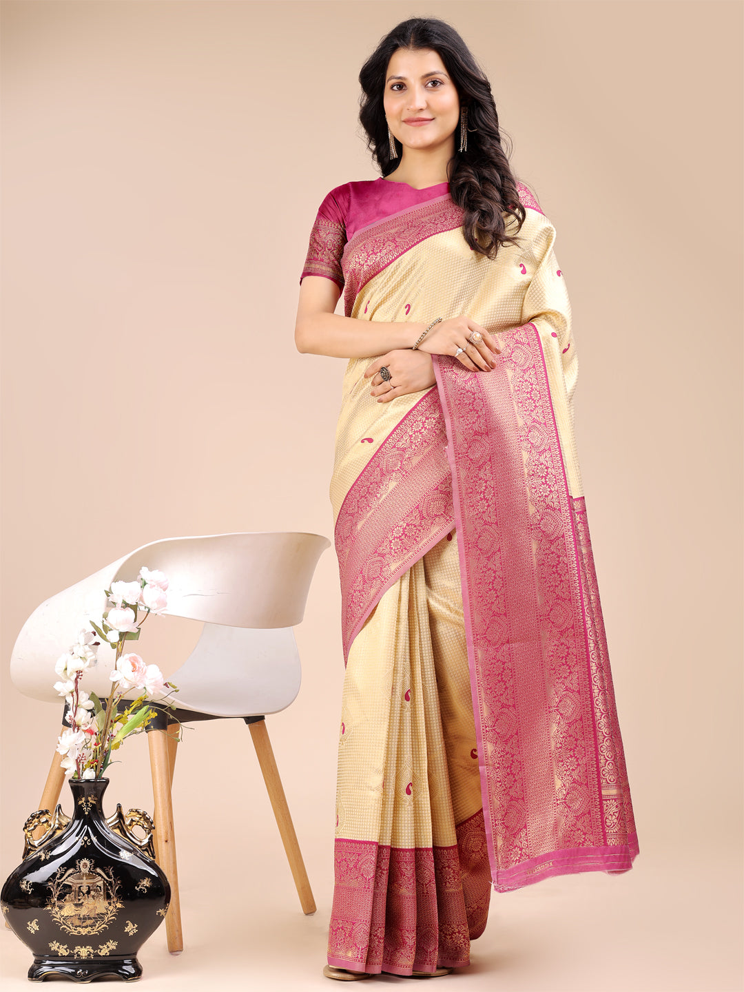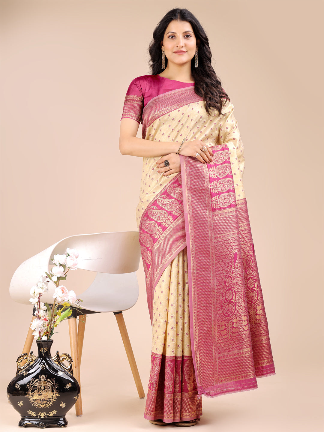 The Cream & Light Green Banarasi Silk Saree beautifully blends elegance and tradition. Made of...