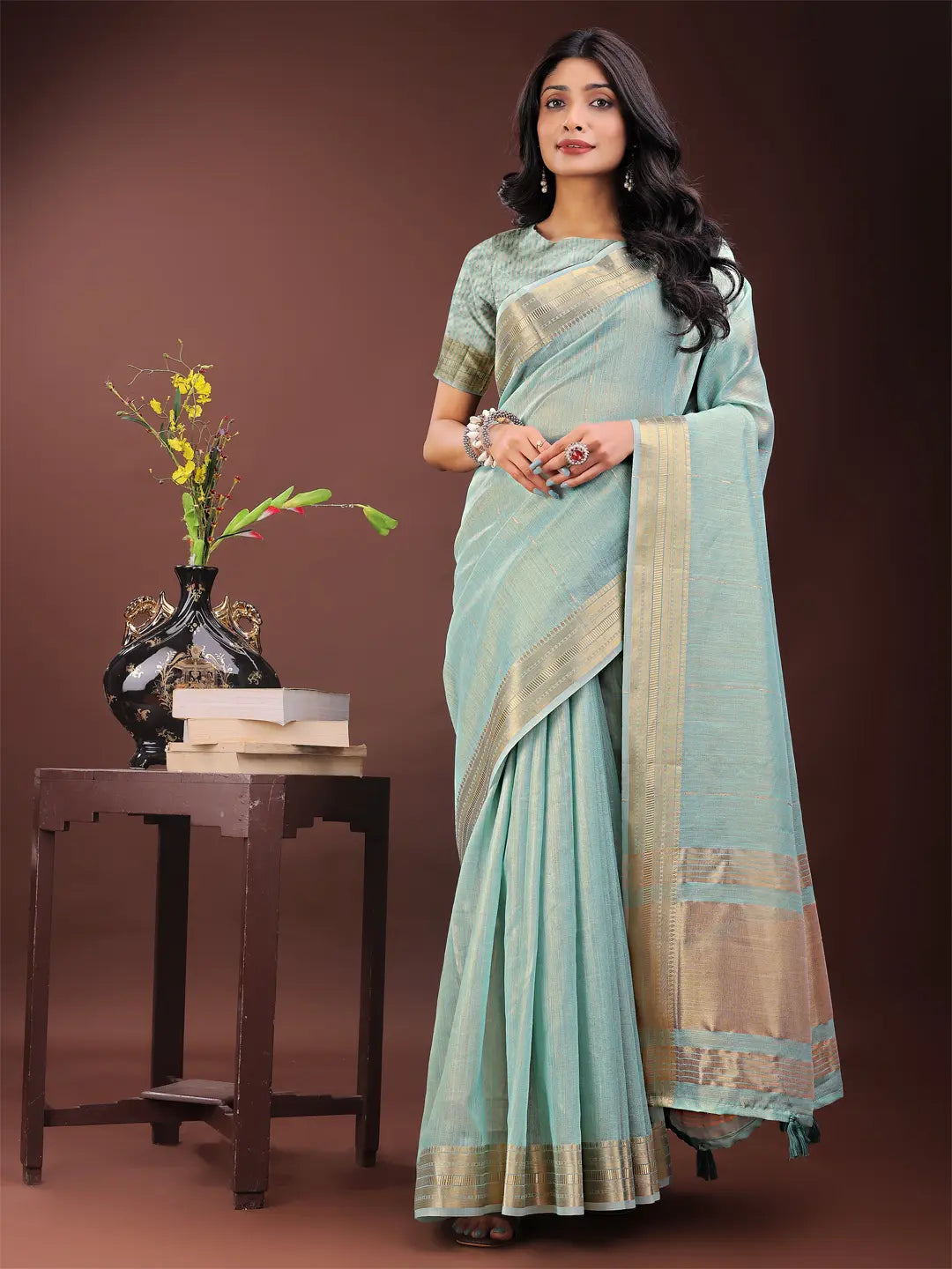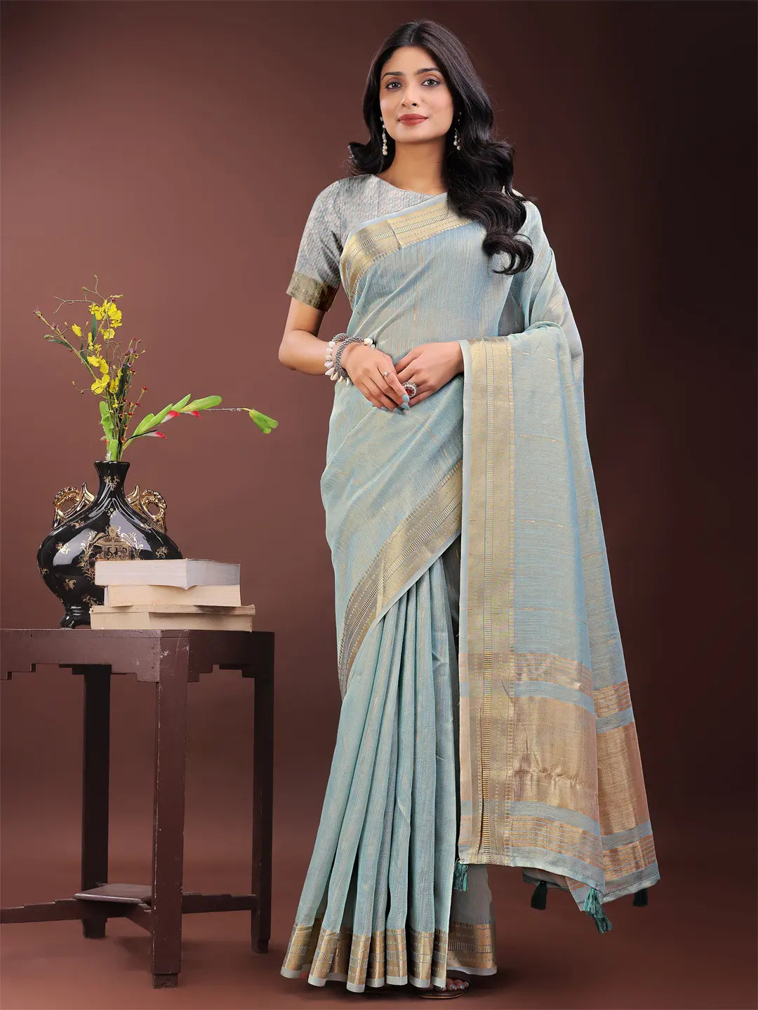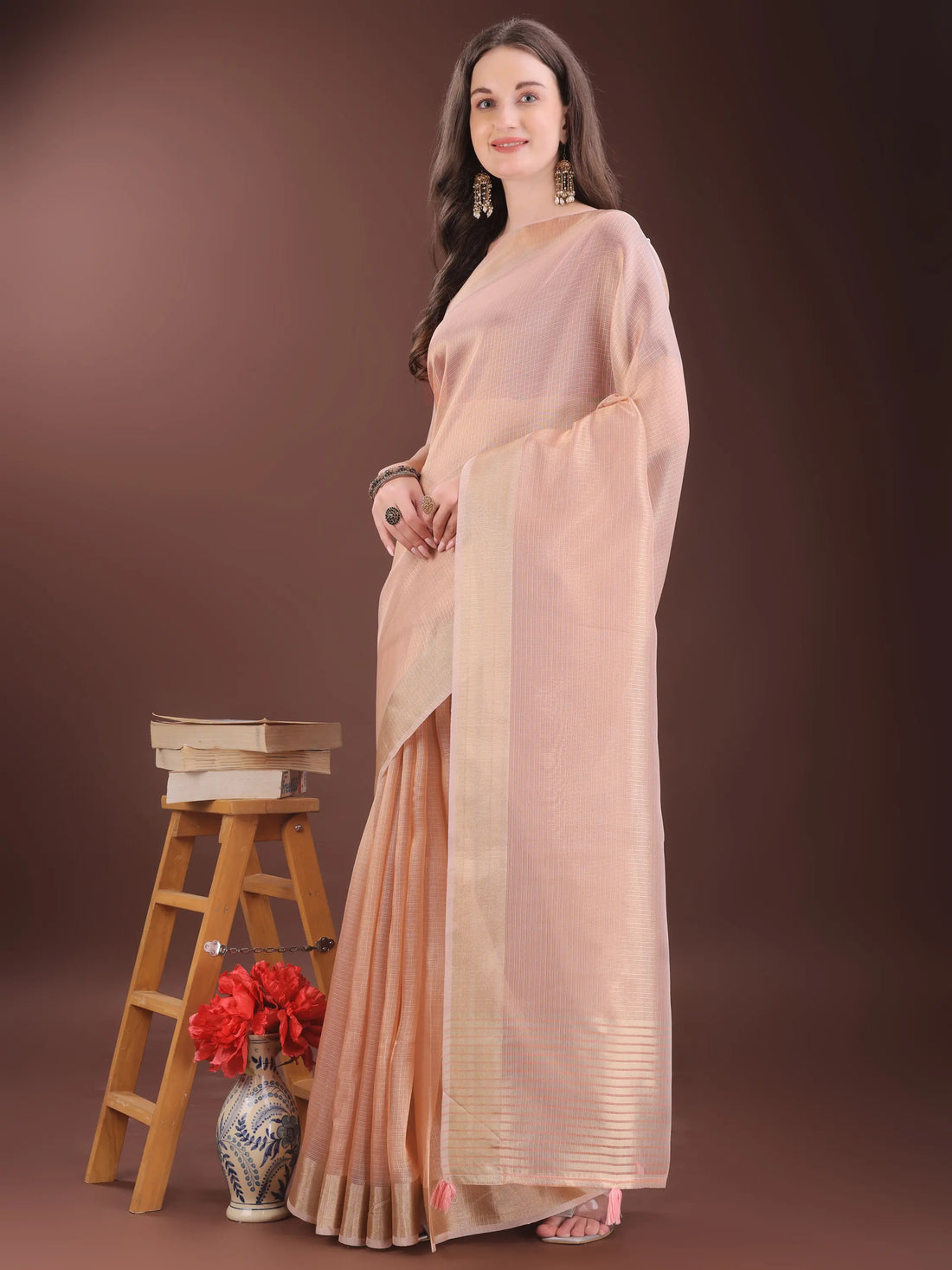 Zari Organza sarees: zari organza saree is little heavier than the printed one, barely highlighted with golden or silver zari weaving or border, best outfits for weddings, festivals and birthday parties.